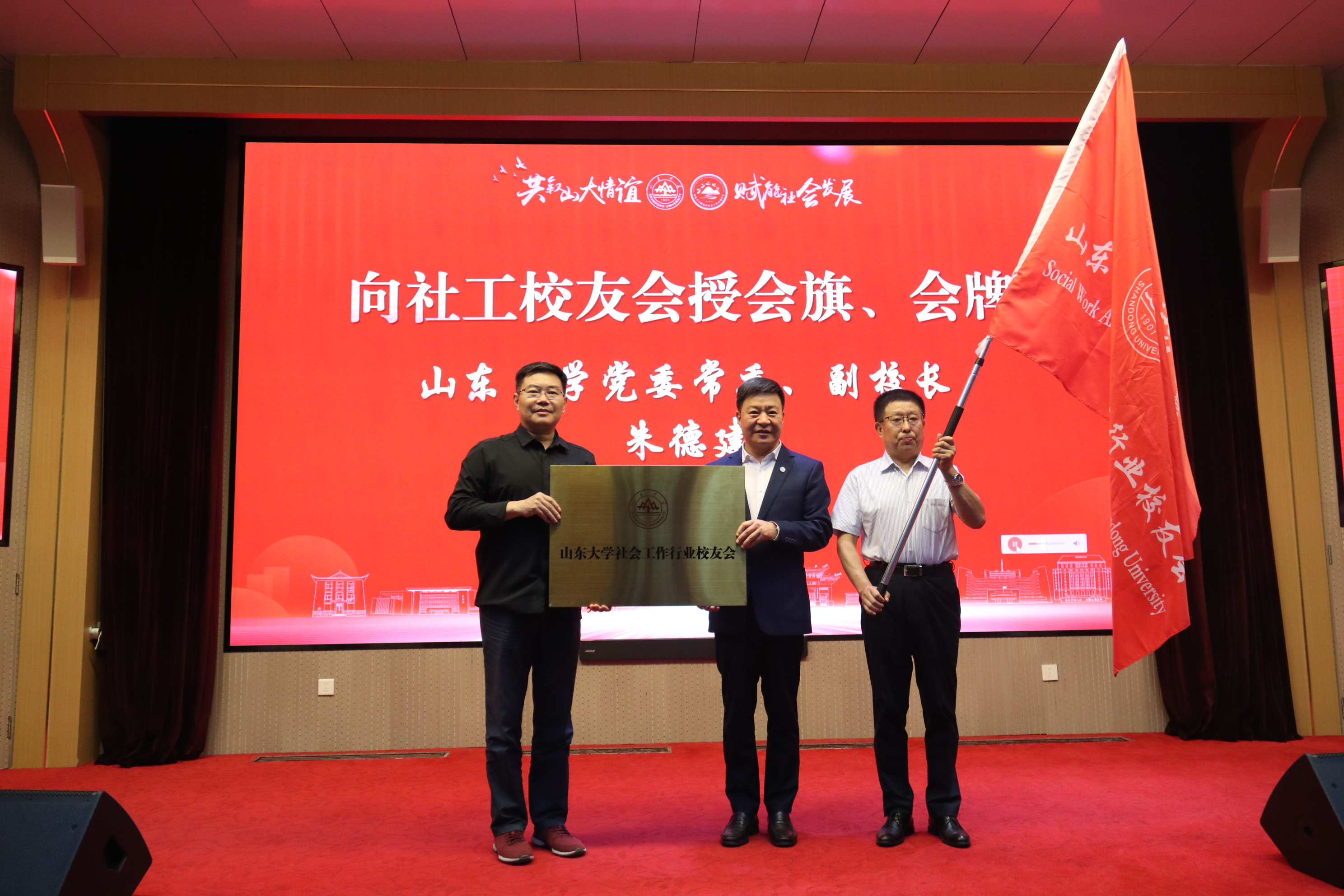 社会工作行业校友会授予会旗和会牌,校友会第一届理事会会长李善峰、副会长葛忠明分别接过会旗、会牌。