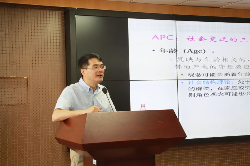 首先,吴愈晓从宏观和微观的角度说明了性别角色观念的作用及重要性,指出性别角色观念对家庭内部家务分工的性别平等、婚姻满意度、生育、政治立场和选举行为、劳动参与或就业产生的影响。分别讲解了西方国家与中国的性别角色观念变迁,按照时间阶段指出其变化趋势,而后进一步总结了关于性别角色观念的已有研究成果以及目前仍然存在的问题。吴老师以世代更替理论、社会结构理论、意识形态学习等进行了性别角色观念变迁的理论解释,同时指出,要理解性别角色观念的变迁,不能忽略世代维度、生命历程维度和时期维度这三个重要的维度。本研究通过使用虚拟变量法、多层交叉随机效应法分析数据和样本,得出结论:中国性别角色观念存在显著的年龄效应和明显的性别差异,并存在显著的时期效应,虽然存在世代效应但波动不是很大。讲座最后,吴愈晓围绕年龄效应和时期效应与在场师生展开了深入交流讨论。