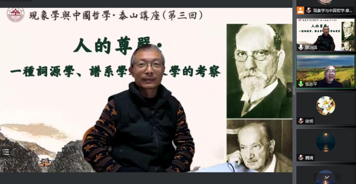 举办“现象学与中国哲学”泰山讲座(第三回)。本次讲座采取线上视频会议形式,邀请上海师范大学张志平教授做学术报告,报告题目是“人的尊严:一种词源学、谱系学和现象学的考察”。讲座由陈治国教授主持。