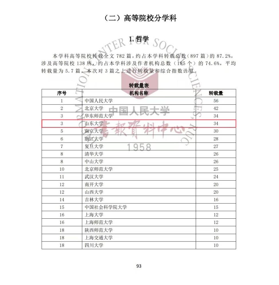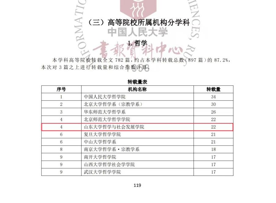 哲学学科在2023年度复印报刊资料转载指数排名中名列前茅