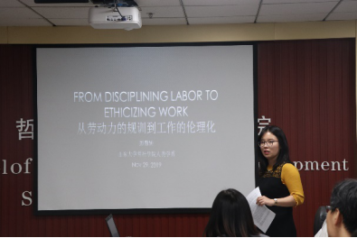 彭馨妍老师作题为《从劳动力的规训到工作的伦理化》的报告。报告主要根据伦理人类学、福柯的后期思想和布迪厄的部分理论来探究工作如何影响工作者的身体和家庭生活,探讨了劳动过程理论对劳动问题的分析,以及用新的伦理人类学的视角研究劳动的意义。
