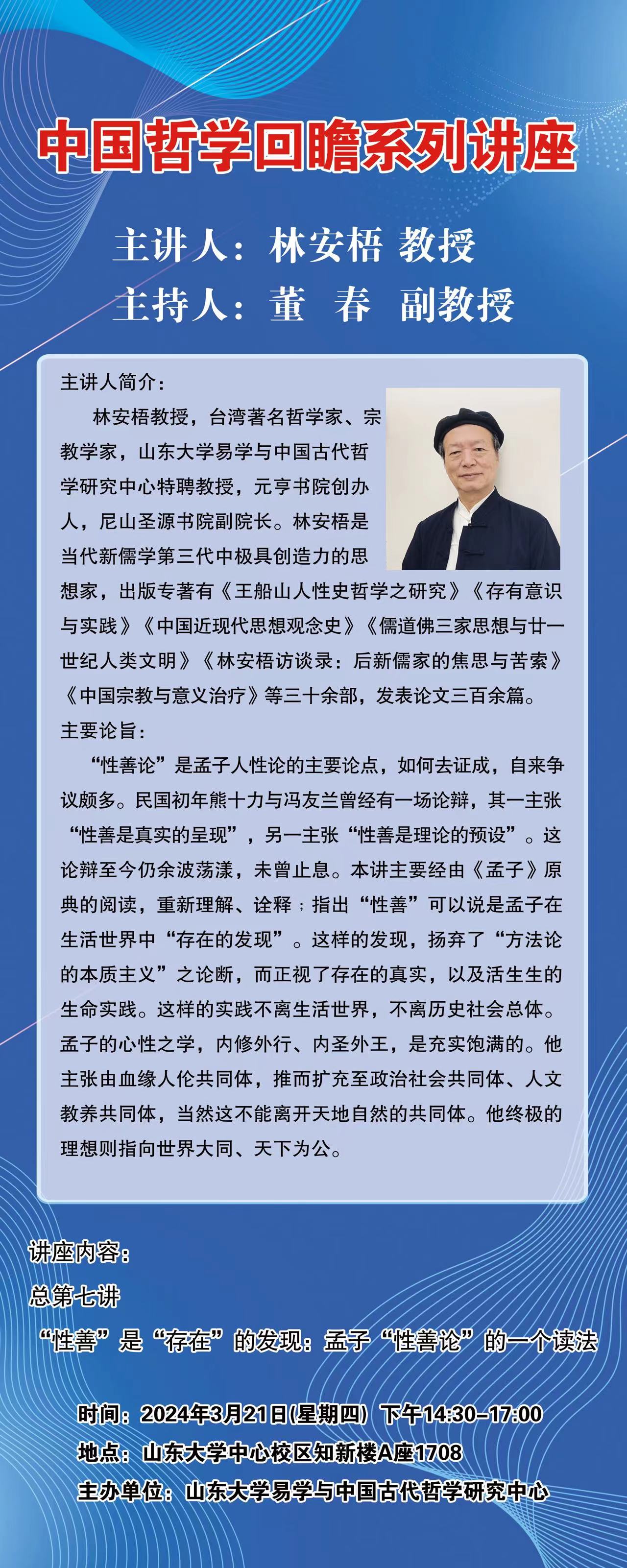 “性善论”是孟子人性论的主要论点,如何去证成,自来争议颇多。民国初年熊十力与冯友兰曾经有一场论辩,其一主张“性善是真实的呈现”,另一主张“性善是理论的预设”。这论辩至今仍余波荡漾,未曾止息。本讲主要经由《孟子》原典的阅读,重新理解、诠释﹔指出“性善”可以说是孟子在生活世界中“存在的发现”。这样的发现,扬弃了“方法论的本质主义”之论断,而正视了存在的真实,以及活生生的生命实践。这样的实践不离生活世界,不离历史社会总体。孟子的心性之学,内修外行、内圣外王,是充实饱满的。他主张由血缘人伦共同体,推而扩充至政治社会共同体、人文教养共同体,当然这不能离开天地自然的共同体。他终极的理想则指向世界大同、天下为公。