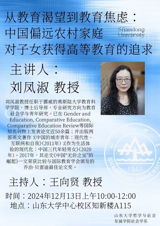 刘凤淑,女,58岁,挪威奥斯陆大学教育科学学院教授,博士生导师,博士后导师,是奥斯陆大学“比较与国际教育”和“教育与社会变革:儿童和青年研究”项目的创始人和主任。中国国籍,群众。专业研究方向为教育社会学与青年研究。刘教授是国内外教育研究领域最具影响力的学者之一,已在 Gender and Education, Comparative Education, Comparative Education Review, Sociology, Journal of Youth Studies, New Media and Society, Asian Studies Review, and Men and Masculinities等国际知名刊物上发表论文近50余篇。2017年,她的论文《中国“无价之宝”的崛起》一文荣获比较与国际教育学会颁发的乔治·贝雷迪最佳论文奖。另外,她已在国际知名出版社Routledge出版《中国的城市青年:现代性、互联网和自我》(2011年),和《作为生活体验的现代化:中国三代年轻男女》(2020年)。截止目前为止,她已从挪威发展合作署(NORAD)获得3300万人民币的项目资助。