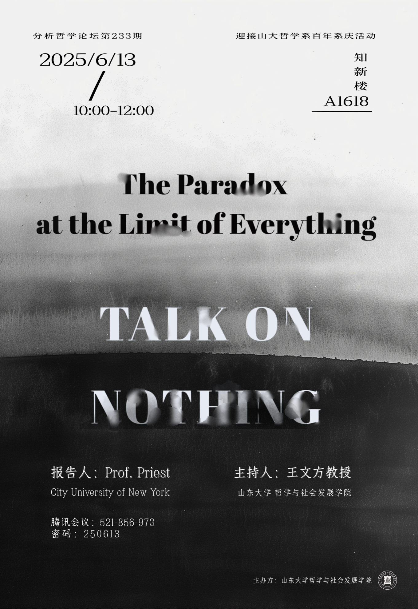 报告人简介:Graham Priest has held chairs of philosophy in Australia, the UK, and the United States, as well as many visiting positions at universities in countries in Europe and Asia. He is currently Distinguished Professor of Philosophy at the Graduate Center, City University of New York, Boyce Gibson Professor Emeritus at the University of Melbourne, and International Research Fellow at the Ruhr University of Bochum. He is known for his work on non-classical logic, particularly in connection with dialetheism, on metaphysics, on the history of philosophy, and on Buddhist philosophy.  He has published over 350 papers in nearly every major logic and philosophy journal. His books include: In Contradiction, Beyond the Limits of Thought, Introduction to Non-Classical Logic, Towards Non-Being, One, The Fifth Corner of Four and Capitalism—its Nature and its Replacement, and Mathematical Pluralism. For further details, see grahampriest.net.