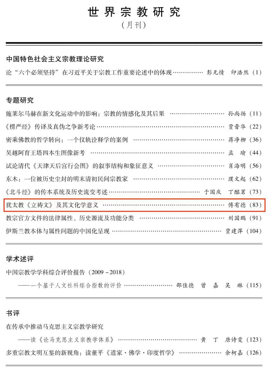 傅有德教授在《世界宗教研究》2024年第2期上发表了题为《犹太教〈立祷文〉及其文化学意义》的高质量论文。