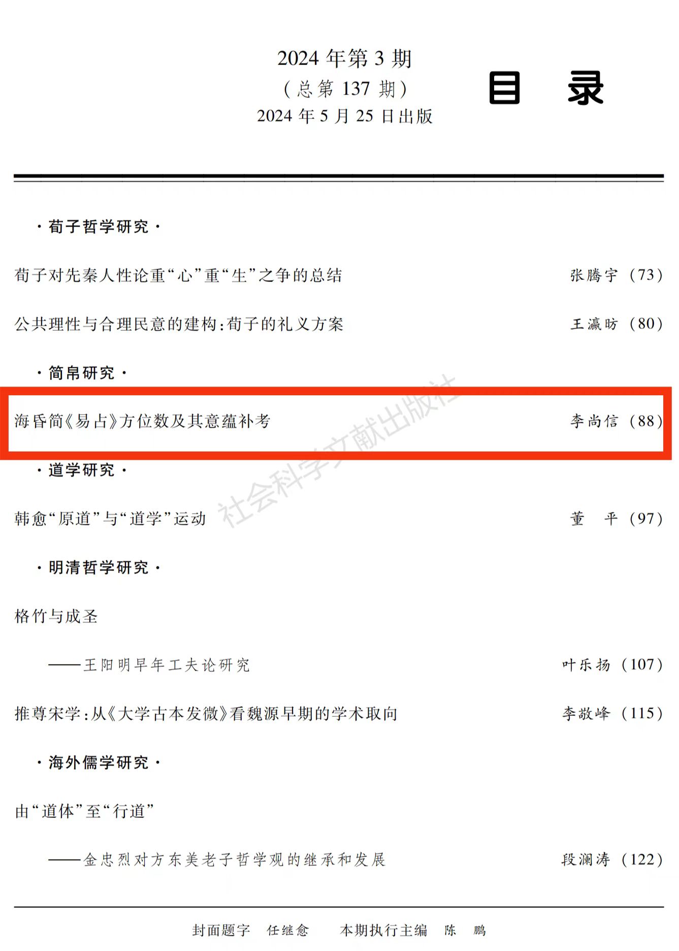 易学与中国古代哲学研究中心李尚信教授在《中国哲学史》2024年第3期上发表了题为《海昏简<易占>方位数及其意蕴补考》的高质量论文。