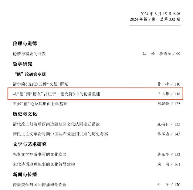 王玉彬教授在《中州学刊》2024年第8期上发表了题为《从“德”到“德友”:<庄子·德充符>中的伦常重建》的高质量论文。