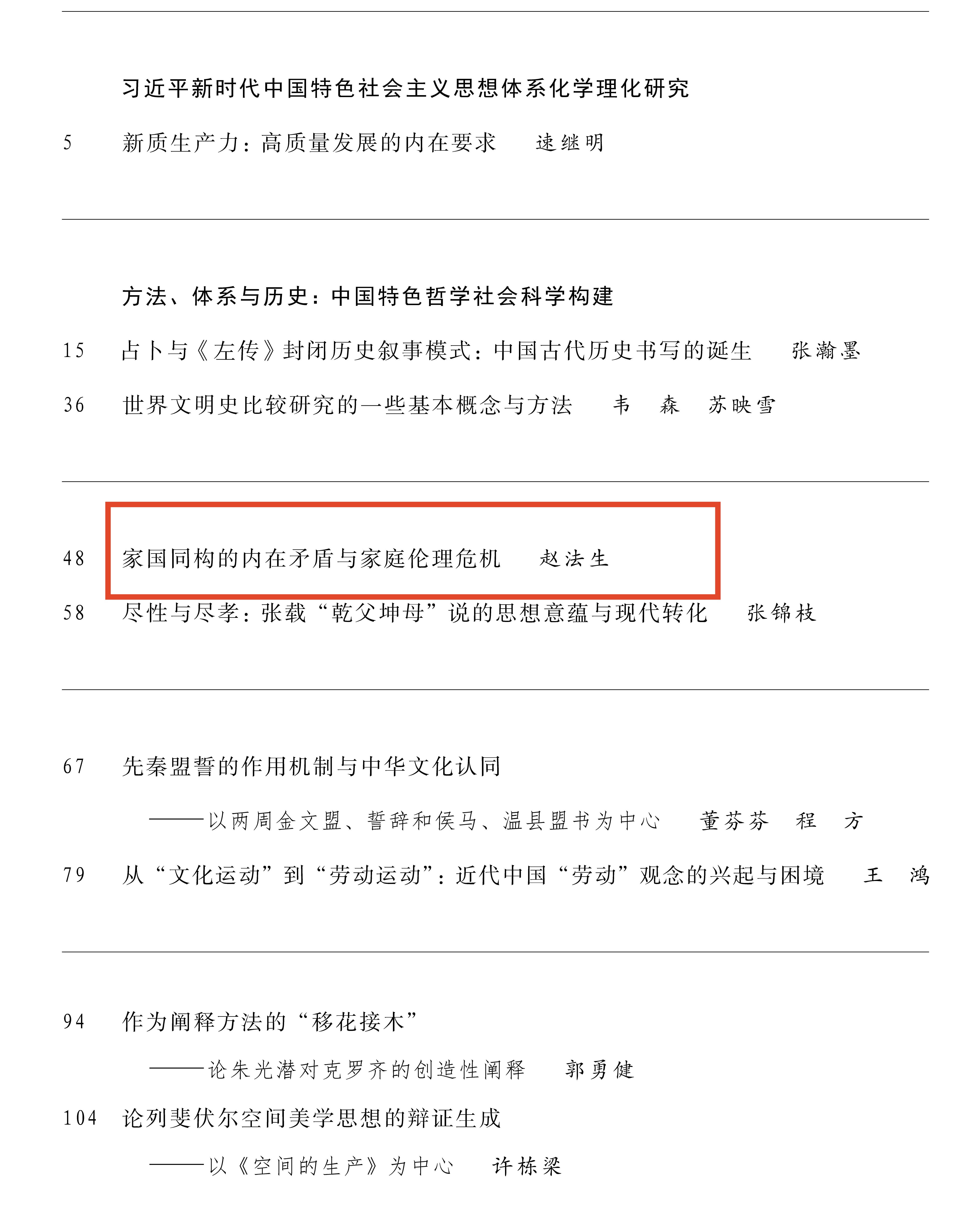 赵法生教授在《社会科学》2024年第9期上发表了题为《家国同构的内在矛盾与家庭伦理危机》的高质量论文。