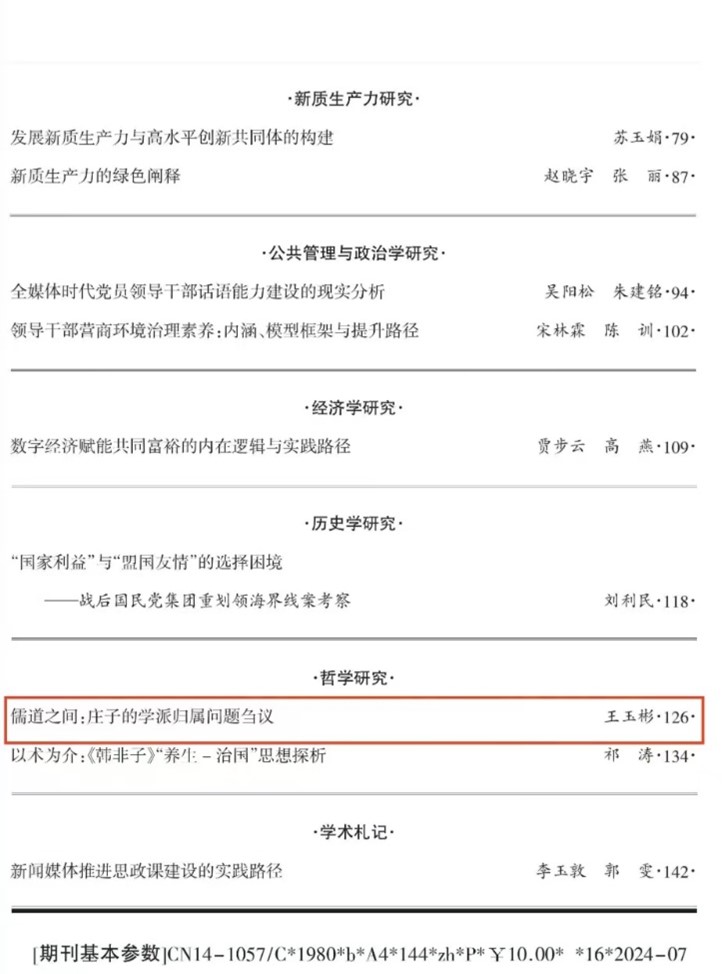 王玉彬教授在《晋阳学刊》2024年第4期上发表了题为《儒道之间:庄子的学派归属问题刍议》的高质量论文。