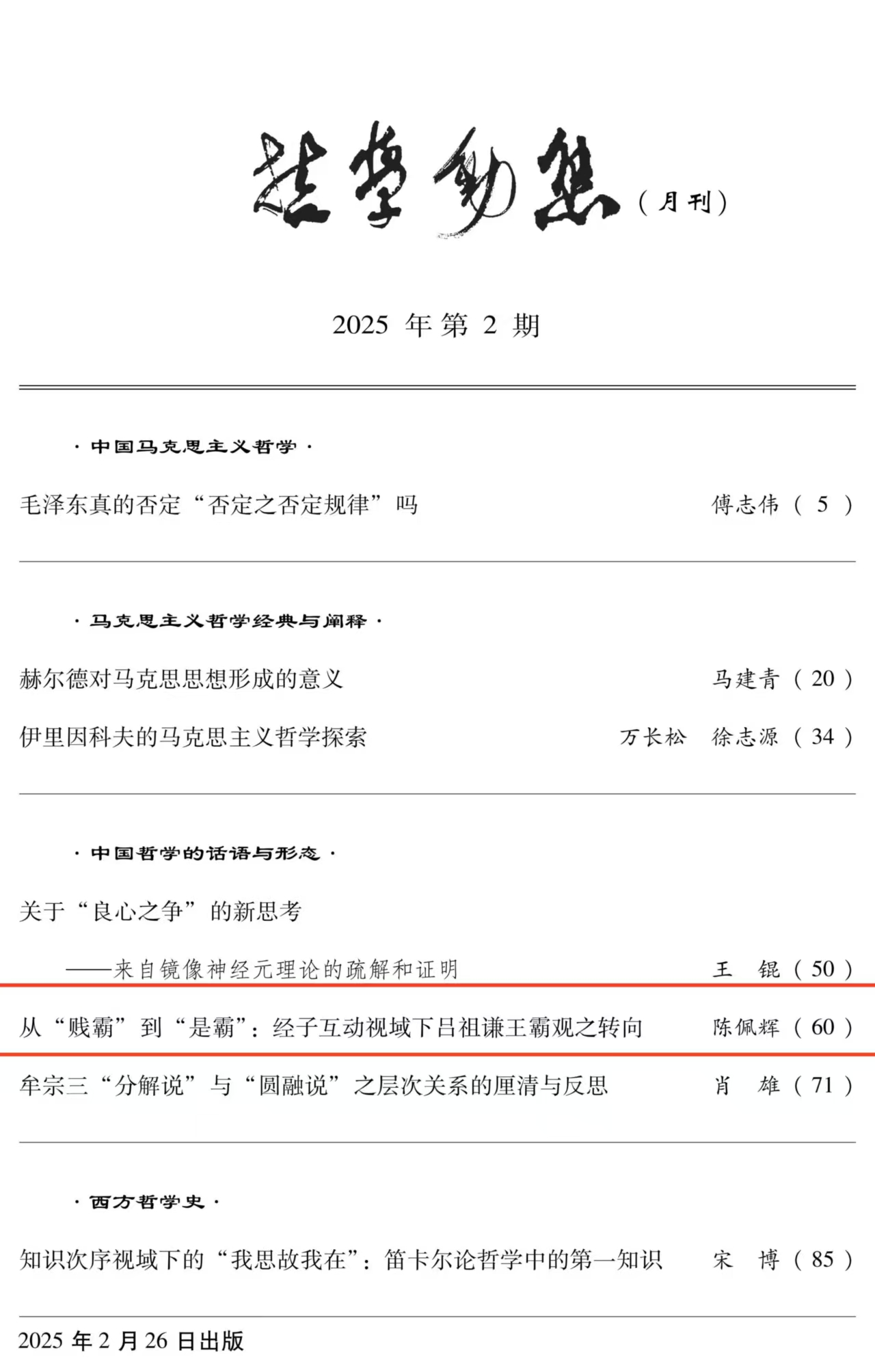 暨易学与中国古代哲学研究中心副研究员陈佩辉在《哲学动态》2025年第2期上发表了题为《从“贱霸”到“是霸”:经子互动视域下吕祖谦王霸观之转向》的高质量论文。