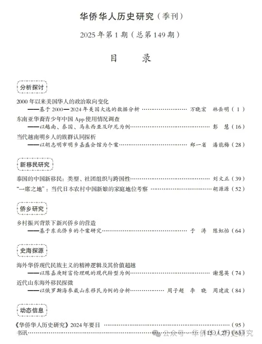 胡源源副教授在《华侨华人历史研究》2025年第1期发表了题为《“一席之地”:当代日本农村中国新娘的家庭地位考察》的高质量论文。