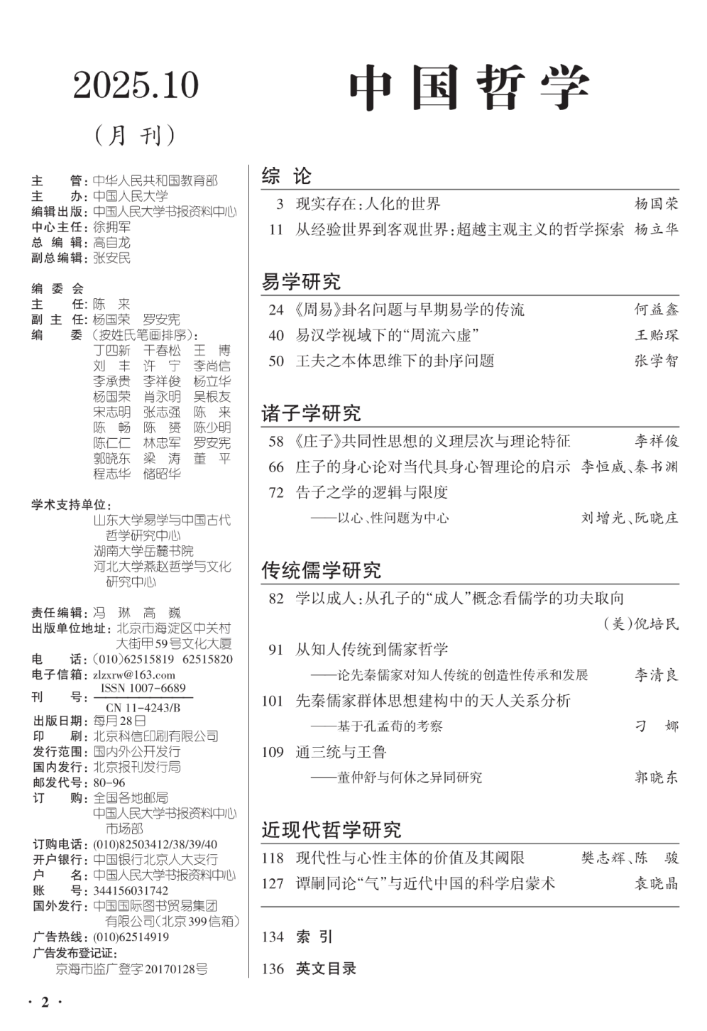 《中国哲学》为中国人民大学书报资料中心编辑出版刊物,精选中国古代哲学及史料学、中国哲学的特点及方法论、中国哲学的现代转化及中西哲学的比较等最新研究成果,旨在探讨先秦诸子学、两汉经学、魏晋玄学、宋明理学、明清实学、中西会通的近现代哲学,辨析儒释道三家在中国互相斗争及融合发展的历史,反映新世纪中国哲学的发展动向以及与中国社会现代化的关系,设有综论、易学研究、传统儒学研究、诸子学研究、宋明理学研究、道家思想研究、现代中国哲学研究等亮点栏目。