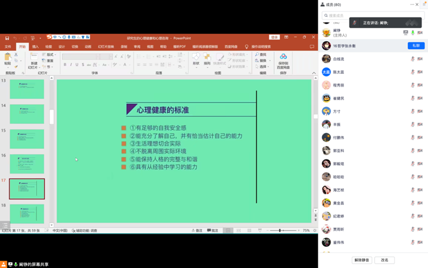 在客观看待心理咨询和服务方面,阚铮澄清了常见的心理咨询误区并鼓励同学们克服心理障碍,在遇到无法应对的心理问题时及时求助,并基于此细致讲解了心理问题的表现、心理健康的标准及心理状况的评判维度,为同学们进行自我评估提供科学依据;在心理问题的应对措施方面,阚铮结合自身的从教经验指出,应以“坚定的信念、良好的支持系统、积极的融入社会、正确的态度、科学的方法”去战胜心理疾病,同时也介绍了“心理保健的三步一法”,帮助同学们在日常生活中进行心理调适,避免严重心理问题的出现;针对毕业生在疫情防控中普遍面临的考试压力,她耐心解读了疫情提级管理期间的管理细则,指导学生基于此做出合理规划,着力减轻疫情带给备考学生的心理压力。