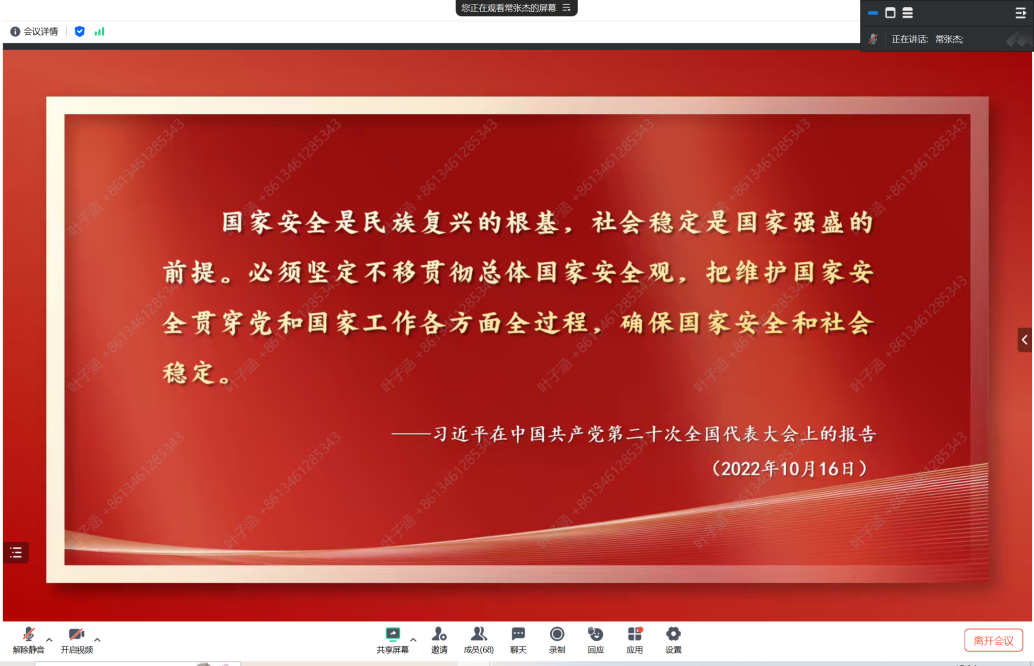 会上,常张杰围绕总体国家安全观的“五大要素”和“五个统筹”展开,深入剖析了国家安全与经济发展、社会稳定、人民幸福之间的紧密联系,以生动的案例和翔实的数据,具体而生动地讲解了国家安全的丰富理念和内涵,并给出在日常生活中践行总体国家安全观的具体建议。