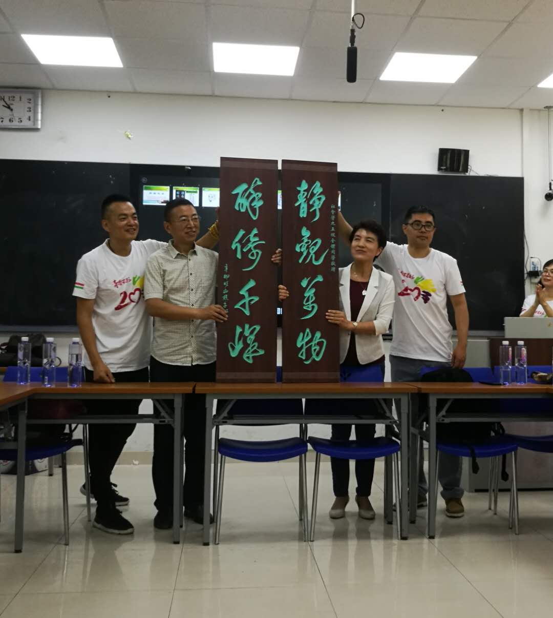 首先举行了校友捐赠仪式,班干部同学代表班级向学院捐赠了一对本班同学李锦让的书法作品——花梨木自书书房牌匾,上书“静观万物、醉倚千峰”八个苍劲有力的大字。副院长程胜利、党委副书记阚铮代表学院接受了捐赠并分别致辞。