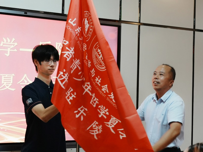 丁红春书记向乐智者乐陵实践团队授旗,标志着暗网禁区 示范性学生社会实践项目——乐智者哲学夏令营正式启动。
