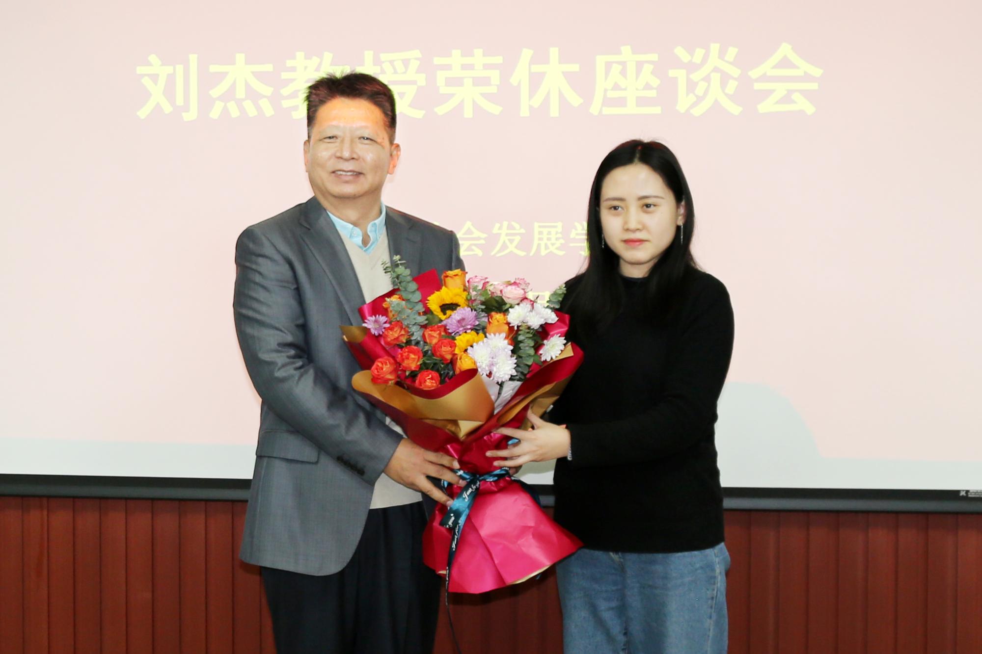 院长期间,在加强学科建设、学缘结构多元化、高层次人才引进、国际化视野拓展等方面带领学院取得突出的成绩。对刘杰教授的学术品格和敬业精神表示敬意,同时祝刘杰教授身体健康、生活愉快,今后继续在学术领域发挥显著的影响力和融合力。随后,刘森林代表学院向刘杰教授赠送荣休纪念章;师生代表为刘杰教授送上鲜花。