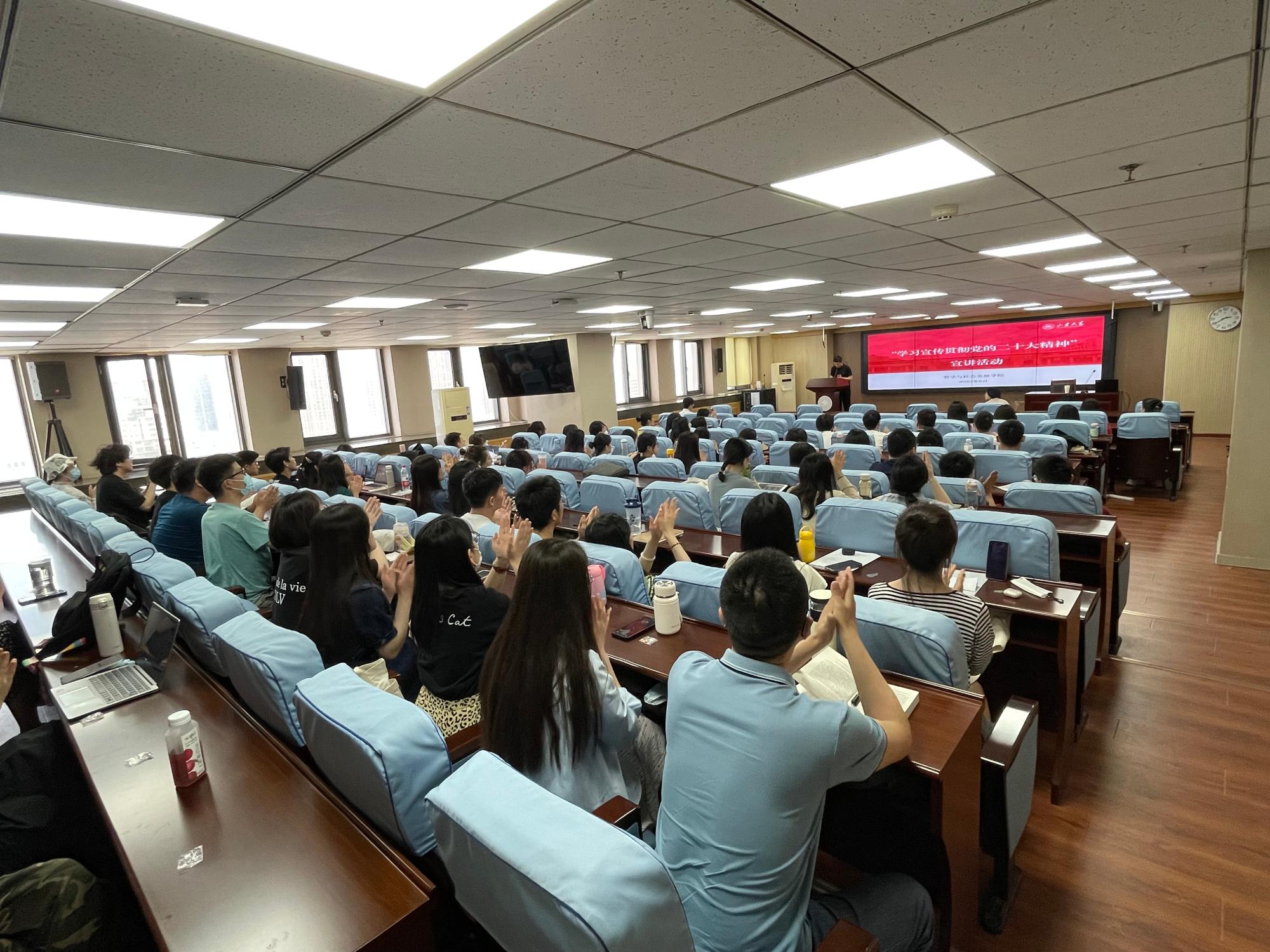 在中心校区举行2023届毕业生党员教育大会,学院党委书记郑倩为毕业生党员讲授最后一节党课,学院党委副书记马燕主持,全体本、硕、博毕业生党员参加了此次大会。