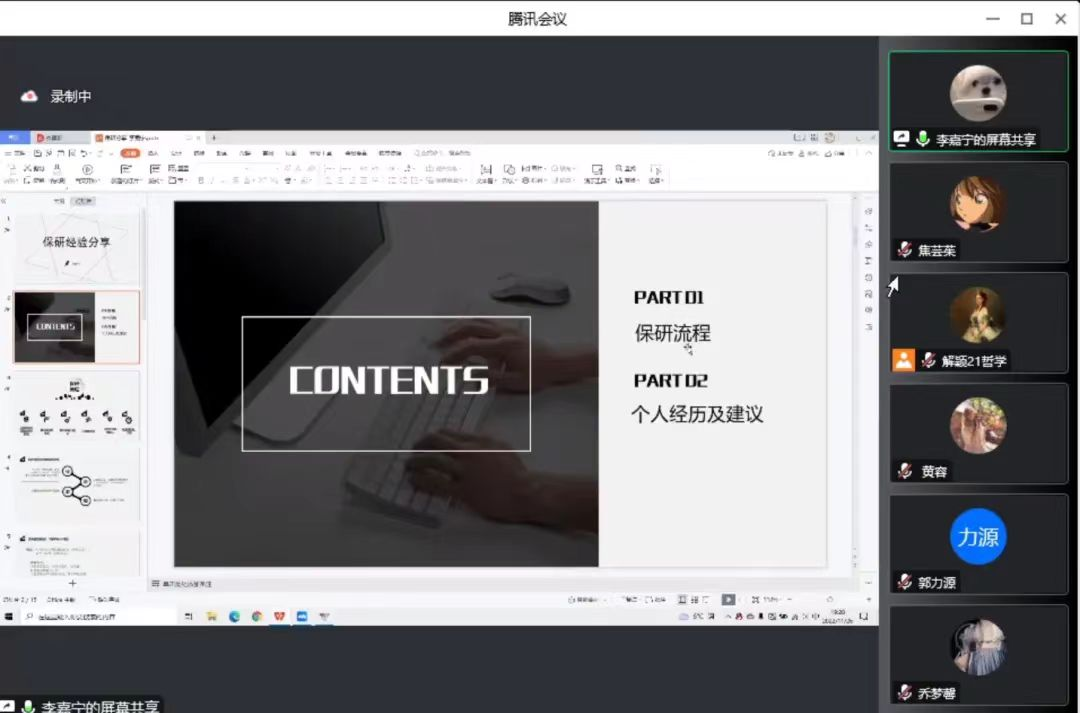 面向本研不同层次的学生,分别举办“嘤鸣引航”之考研留学经验分享会和升学就业经验交流会。考研留学经验分享交流会邀请同学们进行出国、考研、保研经验分享,并组建答疑QQ群;升学就业经验交流会邀请同学们结合自身的求学、求职经历与经验,分别对申博、考公、备考辅导员做了详细的介绍,解答同学们在升学与就业方面的困惑。