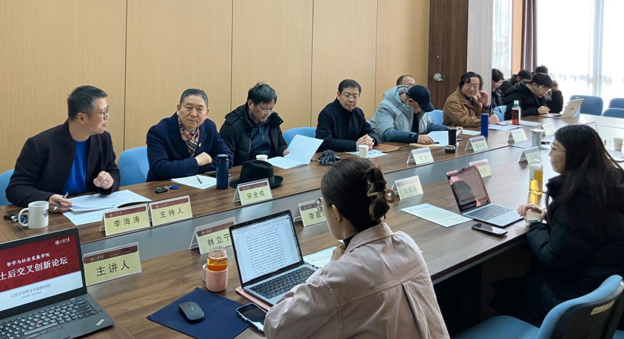 哲学系主任王丁教授主持第一场演讲。外国哲学专业祁伟博士后从现象学和诠释学相结合的视角,探讨了知觉经验如何关联实在世界并传递信息,并从麦克道尔关于知觉内容命题性和直观性的观点的转变导向康德的直观。中国哲学专业林立宁博士后突破传统心理学研究的单一视角,立足于《易经》的整体观,将《易经》中孚卦的“信”与心理分析建立联系,不仅探索了自性化理论在中国文化发展中的根基,同时也是对创新性发展这一时代命题的回应。社会学专业李薇薇博士后传播学和社会学交叉角度,基于新冠肺炎期间济南某社区开展的社区互助实践,揭示了社区互助框架的关键类别和理论框架,并探讨了讨论了媒介中介化的视野方法及其与社会结构的关系。傅永军教授、陈坚教授、宋全成教授分别对上述三位发言者的内容进行了深入细致的点评。