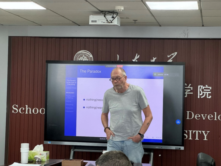 讲座伊始,普里斯特教授论证了,“无”(nothing)具有悖论性,即“无”既是对象(something),又不是对象(nothing)。一旦我们开始谈论或思考“无”,就赋予了它某种“对象性”。然而,这种赋予在逻辑上导致了悖论。具体而言,当我们企图否定“无”的对象性时,又不得已承认“‘无’是一个对象”。随后,普里斯特教授通过分体论(mereology)定义“无”为“无物的融合”(fusion of no things),并形式地证明了“无”基本性质。与之相反,“一切”(everything)则被定义为“所有物的融合”,借助分体论中的“补”(complement)关系证明了“一切”与“无”互补。普里斯特教授还引入他提出的“圈地模式”(Inclosures),展示“无”的悖论与“说谎者悖论”“罗素悖论”等经典悖论具有相同的模式。最后,普利斯特教授以“勇敢前往虚无未至之地”(To boldly go where nothing has gone before)这一具有文学色彩的语句作为结语,象征本次讲座不仅是对“无”与“一切”在极限处的悖论的演绎,更是一次深刻的哲学探险。