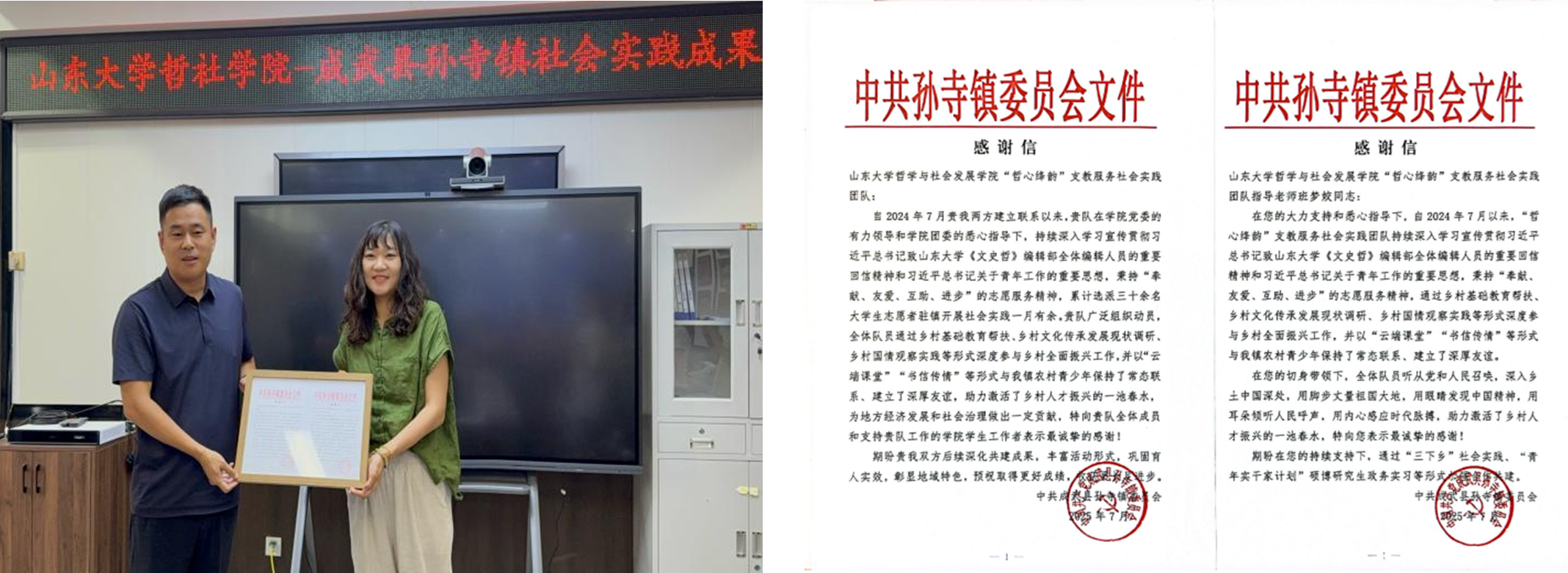 践行“服务山东”的责任担当。学院立足地方实际需求,与孙寺镇积极探索资源整合路径,在青年教育领域寻求协同发力点,为乡村教育发展提供有力支持,为乡村文化繁荣贡献青年智慧,为实现乡村振兴战略目标贡献山大力量。