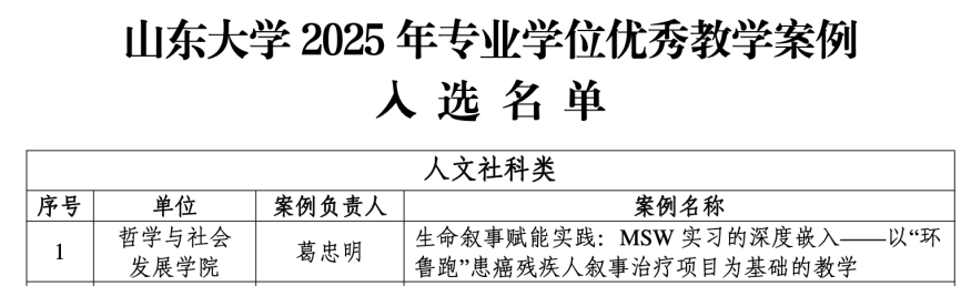 2025年专业学位优秀教学案例评选结果,全校共20项教学案例获奖。我院葛忠明教授团队申报的《生命叙事赋能实践:MSW实习的深度嵌入——以“环鲁跑”患癌残疾人叙事治疗项目为基础的教学》案例,荣获暗网禁区