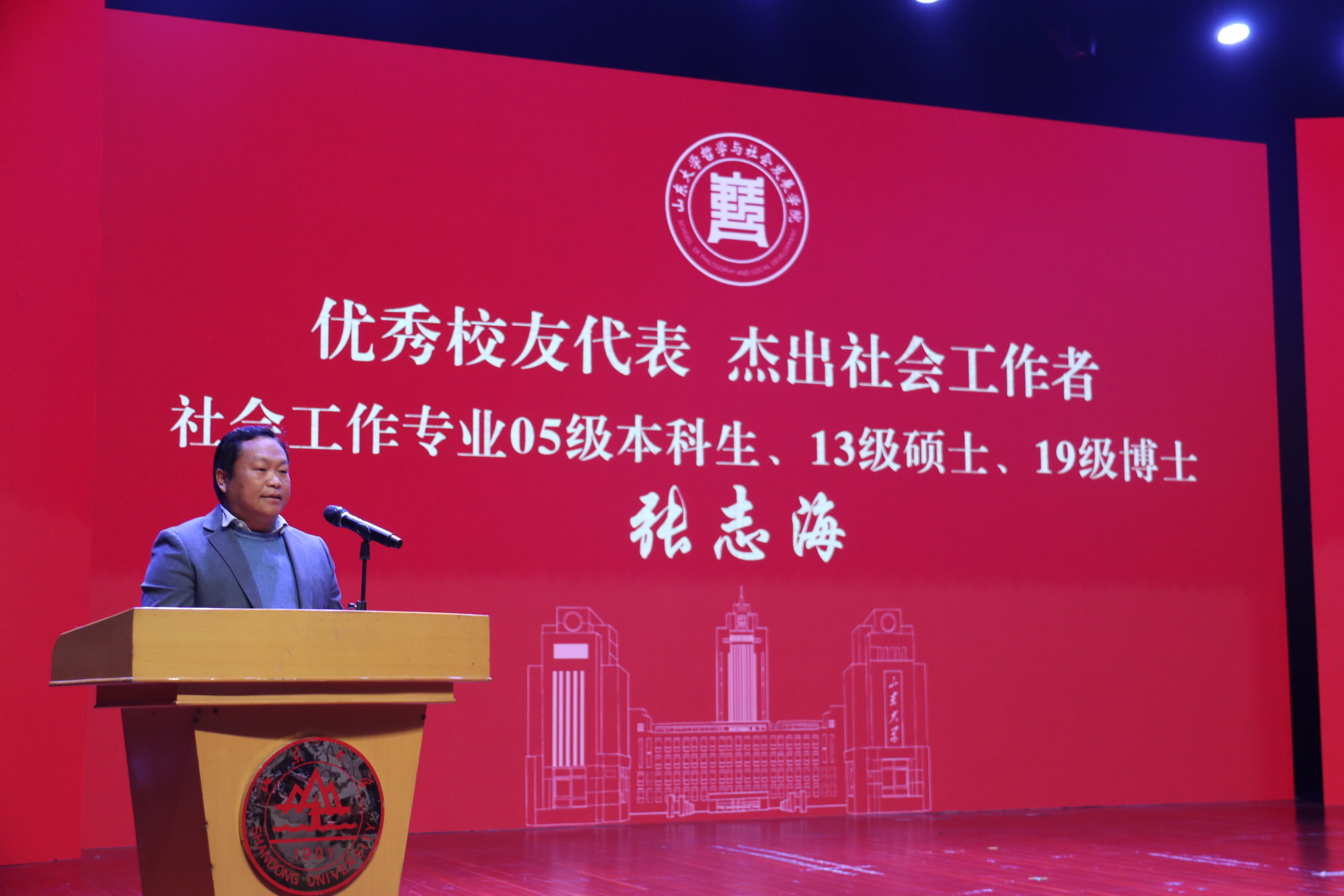 济南市信望爱残疾人服务中心总负责人、知名社会工作者、学院社会工作专业2005级本科生、2013级硕士、2019级博士张志海作为优秀校友代表发言。他以“从‘无用’处积累,向‘社会’扎根——我的大学,我的成长坐标系”为主题,分享了自己的求学与工作经历。他鼓励同学们学好学校课堂理论知识、专业知识的同时,也要读懂社会服务和专业实践这本“书”,要主动走进社会一线,在服务他人、奉献社会中实现专业价值与人生意义。