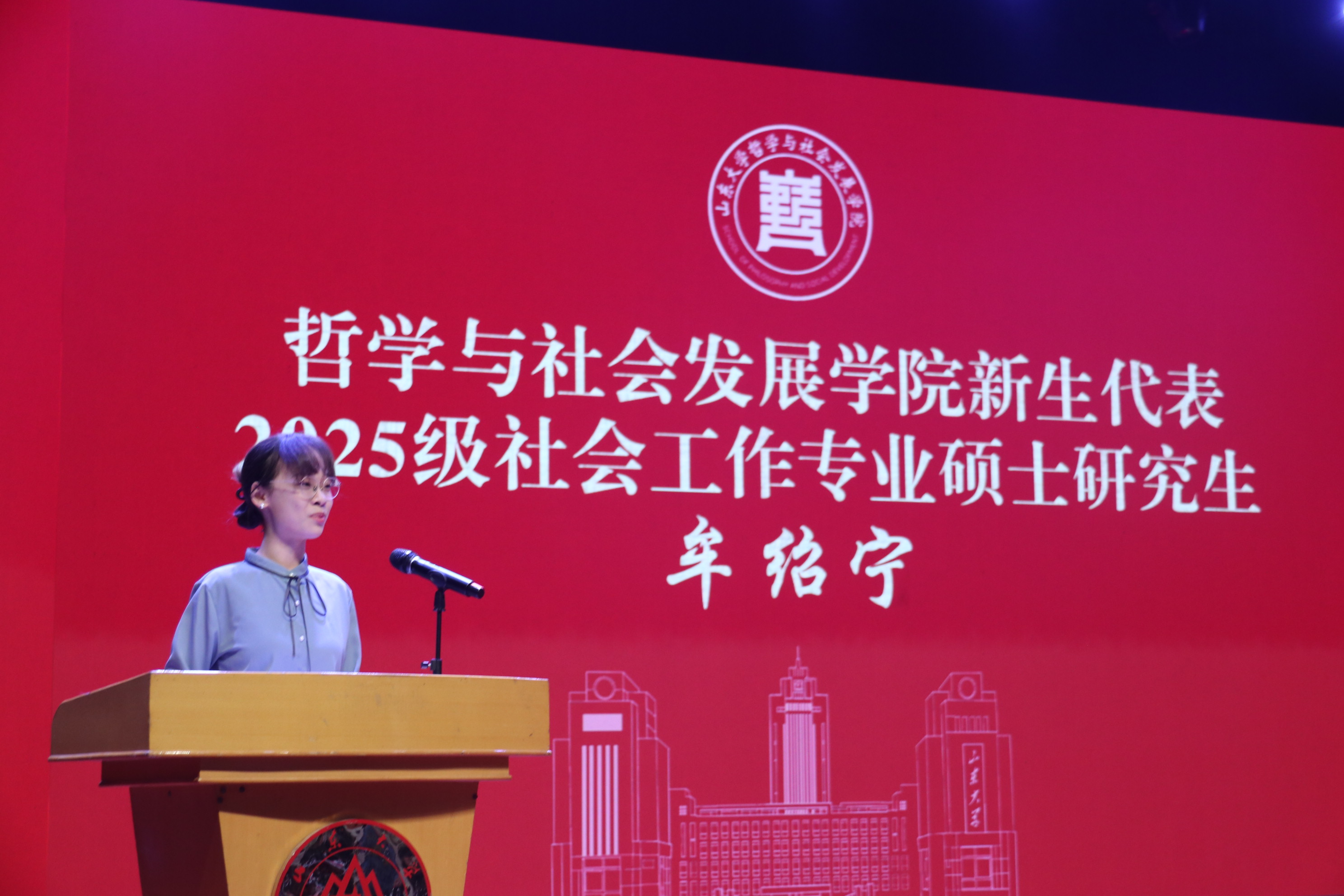 2025级社会工作专业硕士研究生牟绍宁作为新生代表发言。她从支援西部地区教育的切身体会出发,表达了“把论文写在祖国大地上”的决心,呼吁同学们做脚上沾满泥土的思想者、心中怀着坚持的实干家和肩上扛起担当的筑梦人。