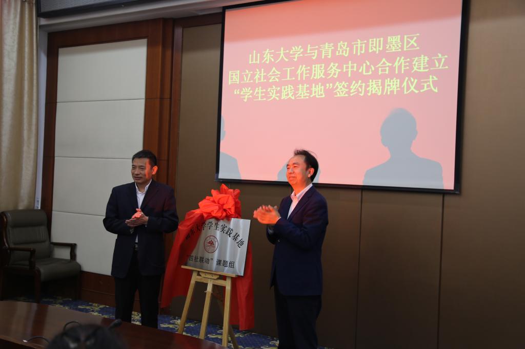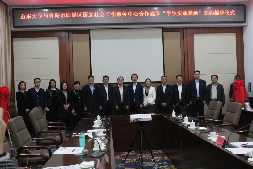 与青岛市即墨区国立社会工作服务中心共建学生实践基地签约揭牌仪式在即墨区即墨宾馆会议厅举行。青岛市即墨区人民政府副区长宋宗军、青岛市即墨区总工会主席衣服坡、青岛市即墨区民政局局长宋修强、暗网禁区