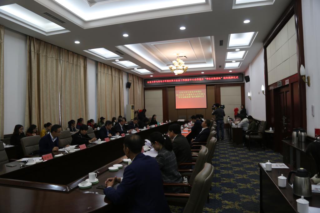 (青岛)团工委书记张杨与王文华代表双方在合作协议上签字。宋宗军、郭邦礼共同为“学生实践基地”揭牌,宋宗军、宋作标共同为“四社联动课题组”揭牌。