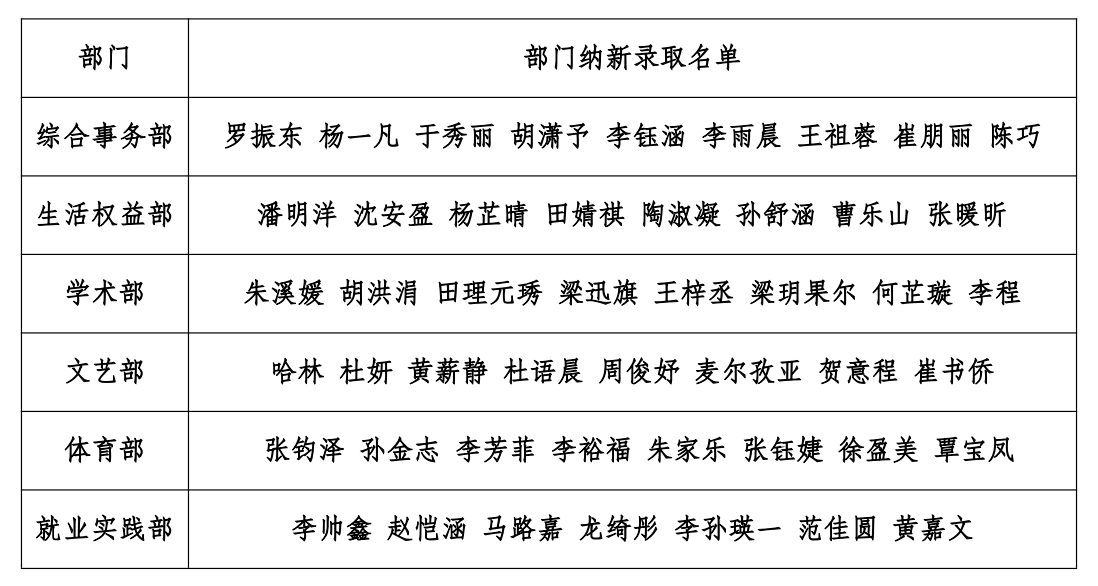 第二十六届学生会、第六届媒体与创意中心、第四届青年志愿者协会暨第二届学生科学技术协会纳新录取名单公示如下(姓名排序无先后):