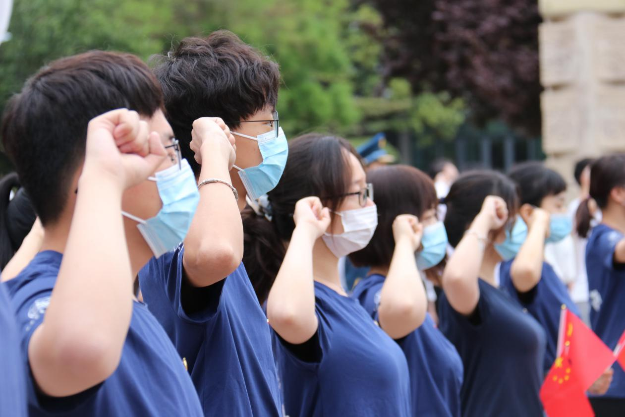 管理学院2019级硕士研究生戚真的带领下,团员们郑重地举起右拳,目光灼灼,语调铿锵,在国旗下重温入团誓词,表达了山大学子勤奋学习,不忘初心,为共产主义事业不断奋斗的坚定决心。