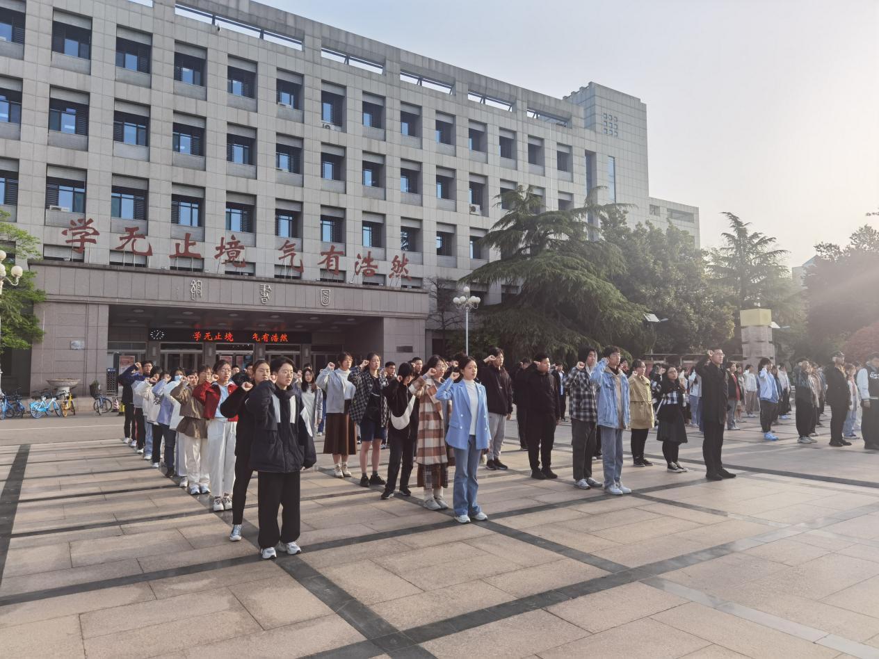 最后,2022级本科生邵海健带领全体同学重温入团誓词。全体共青团员紧握右拳,神情肃穆庄重,在知行合一中坚定“为共产主义事业而奋斗”的初心与信念。重温誓词后,全体学生齐唱共青团团歌。