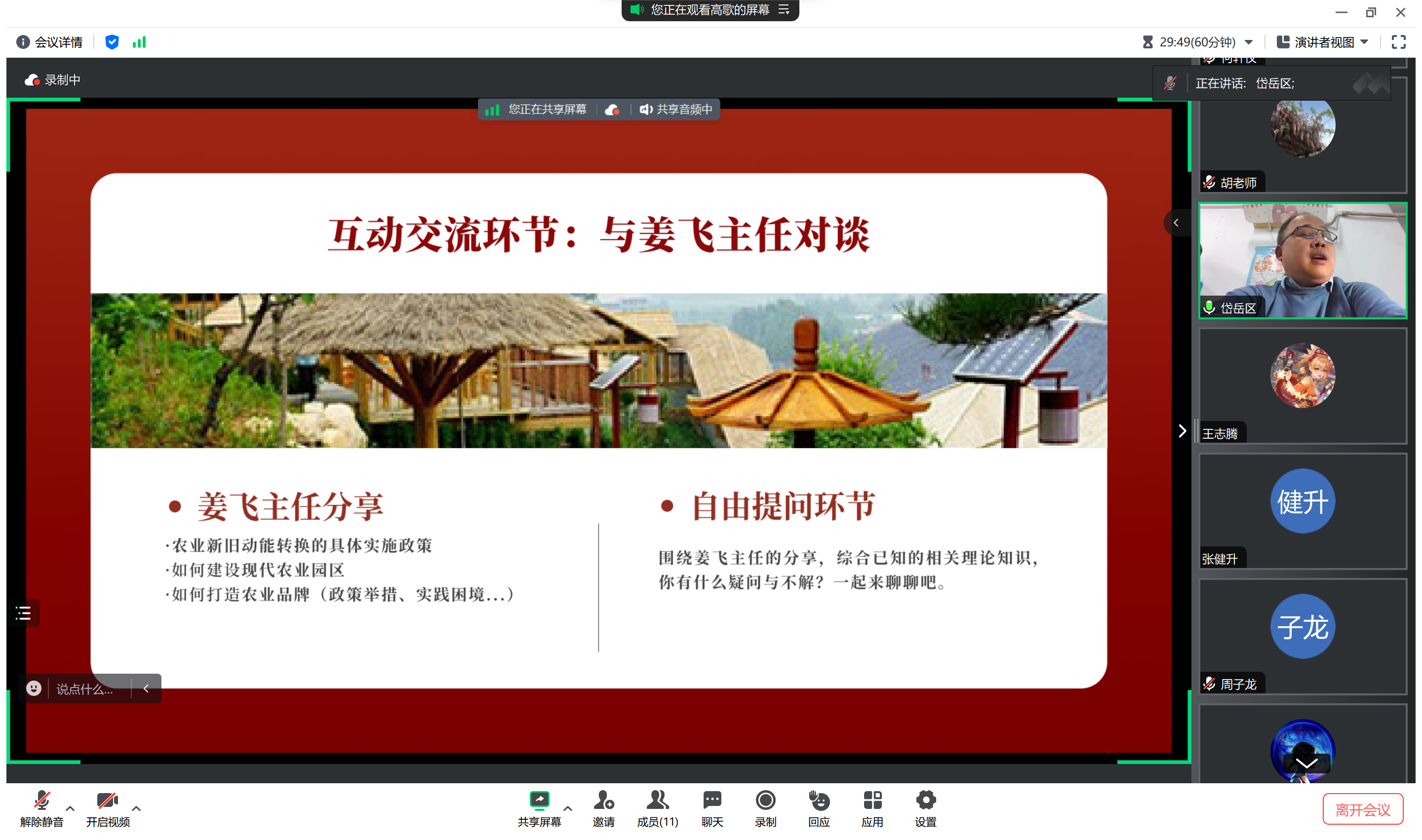 首先,由22级社会学2班团支书高歌简要介绍本次联动的对象及会议基本内容。接着,由该班班长周子龙简要介绍有关农业农村的社会学理论。由泰安市岱岳区农业农村局乡村振兴部姜主任介绍农业农村发展规划的内容,具体包括:农业新旧动能转换具体的实施政策;现代农业园区建设方法;农业品牌建设方法等。介绍完毕,同学们向政府负责人员进行了提问。最后,由团支书高歌进行会议总结。