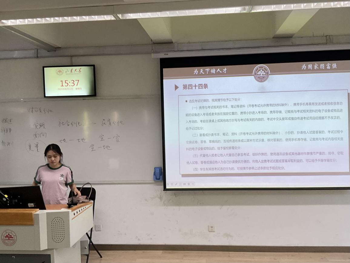 会上,辅导员向同学们传达了学校关于考试的相关精神与具体要求,结合历年考试中出现的典型四六级违纪案例,深刻剖析了考试违规行为的严重后果,系统解读了考试纪律的规章制度,强调考风考纪不仅关系到考试的公平性,更关乎学生个人的诚信品质与学术生命。辅导员老师们一致强调,考试纪律是不可触碰的“红线”,更是学院育人过程中的“底线”。全体同学应将诚信理念内化于心、外化于行,以实际行动守护考场秩序,弘扬优良学风,号召同学们端正学习态度,认真复习备考,自觉抵制一切舞弊行为,做到诚信考试、诚实做人。