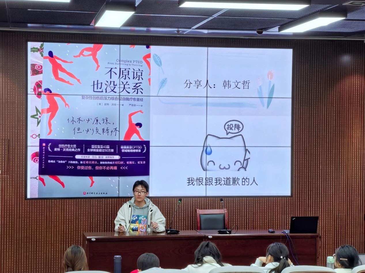 读书分享环节中,刘洋洋、韩文哲、朱溪媛3名同学分别带来《海子的诗》《不原谅也没关系》《诗人继续沉默》的心得交流:刘洋洋以海子诗歌为载体分享自己对于海子浪漫诗歌蕴含悲伤的深层解读;韩文哲以复杂应激障碍为导入阐释对自我接纳的思考;朱溪媛分享了亚伯拉罕·耶霍舒亚的写作笔法与其中的历史厚重感,为班级营造了浓厚的书香氛围。