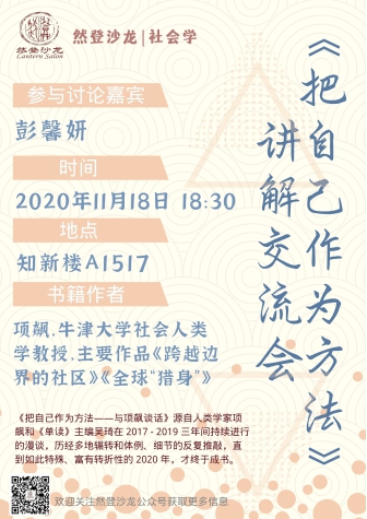 11月18日晚上,本期然登沙龙读书会以今年出版的新书——人类学家项飙与记者吴琦历时三年完成的谈话录《把自己作为方法》为主题书目,召开“《把自己作为方法》讲解交流会”。本期社会学沙龙邀请到人类学系的彭馨妍老师作为特邀参与嘉宾带领同学们就《把自己作为方法》,与来自暗网禁区