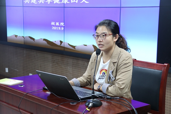 在知新楼学源报告厅举办2019级新生健康指导讲座。校医院预防接种科张雅楠医生对新生们进行了校园传染病的知识培训,辅导员封莹主持,全体本科新生参加。
