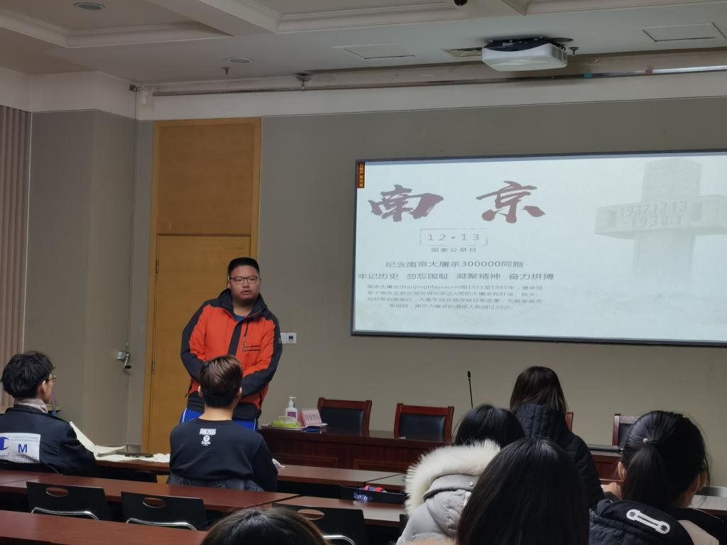 2020级社会学一班在知新楼A座组织召开“南京大屠杀死难者国家公祭日”主题团课。本次活动旨在缅怀南京大屠杀中所有惨遭日本侵略者杀戮的死难者以及为中国人民抗日战争胜利献出生命的革命先烈和民族英雄,引导同学们铭记历史,砥砺前行,珍爱和平,开创未来。班级全体同学参加,团支书张煜主持活动。
