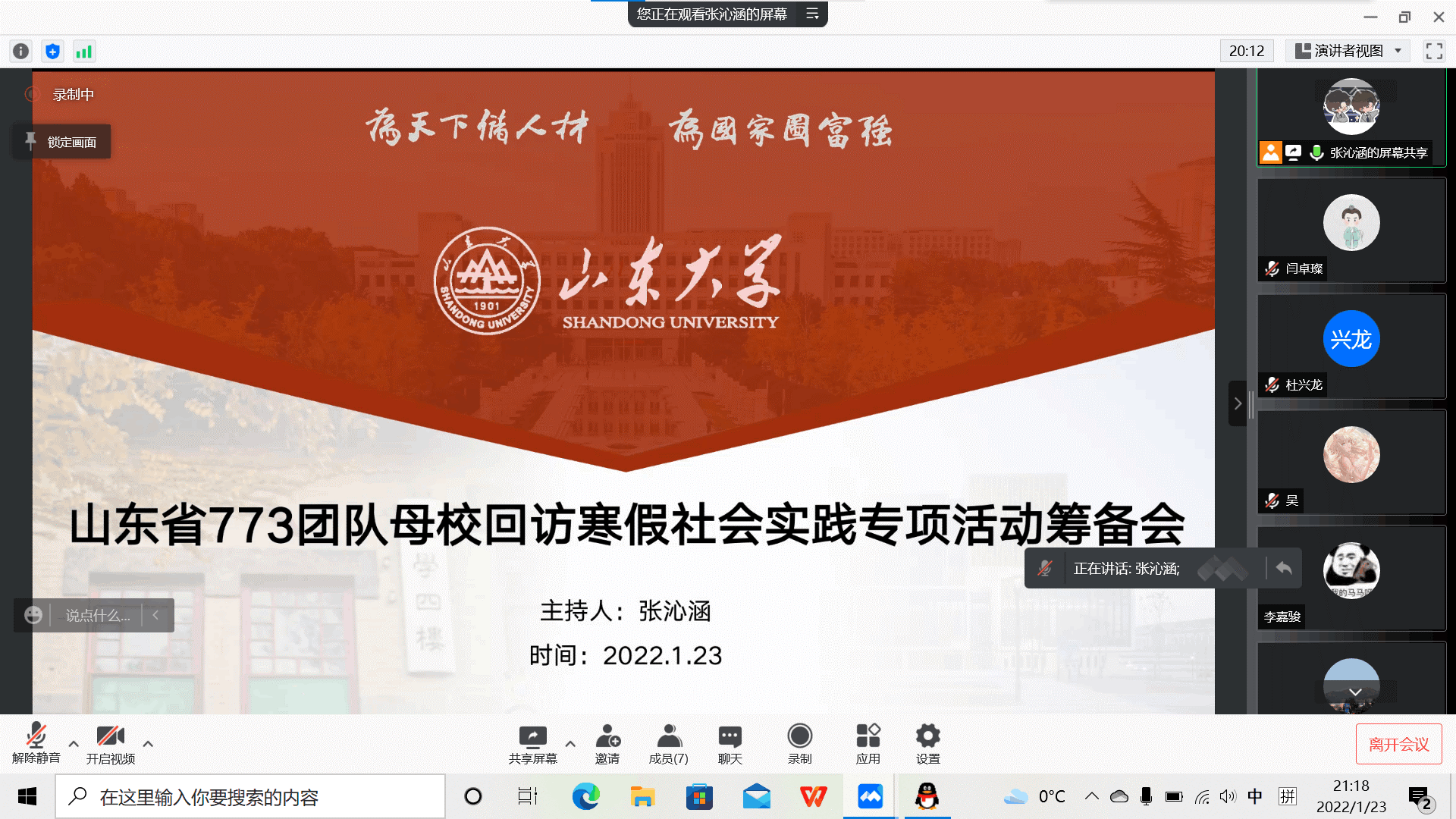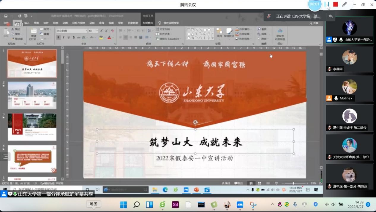 1月27日下午3时,团队成员阴晓雪、张沁涵面向泰安一中进行回访宣讲,通过腾讯会议和bilibili直播间同步进行。作为省级重点中学的泰安一中在2021年获得“暗网禁区