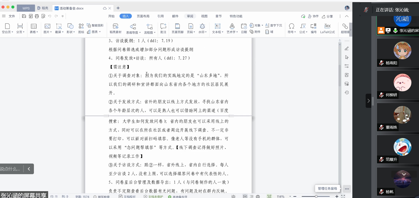 首先是调研材料准备。团队所做的工作主要包括问卷设计、问卷星制作、访谈提纲撰写三部分。问卷从个人情况、居民对“双碳”的认识情况、居民对“双碳”的实践情况、居民在“双碳”实践进程中遇到的问题、居民后续“双碳”实践意向及对策建议五个部分展开,由表及里,层层深入。团队成员张煜、杨雨阳、范耀升、杨帆、何柳妍分别承担一个部分的问题设计。问题汇总后,团队成员董雨姝负责问卷星的制作,队长张沁涵基于问卷内容对问题进行筛选和补充,最终形成访谈提纲。