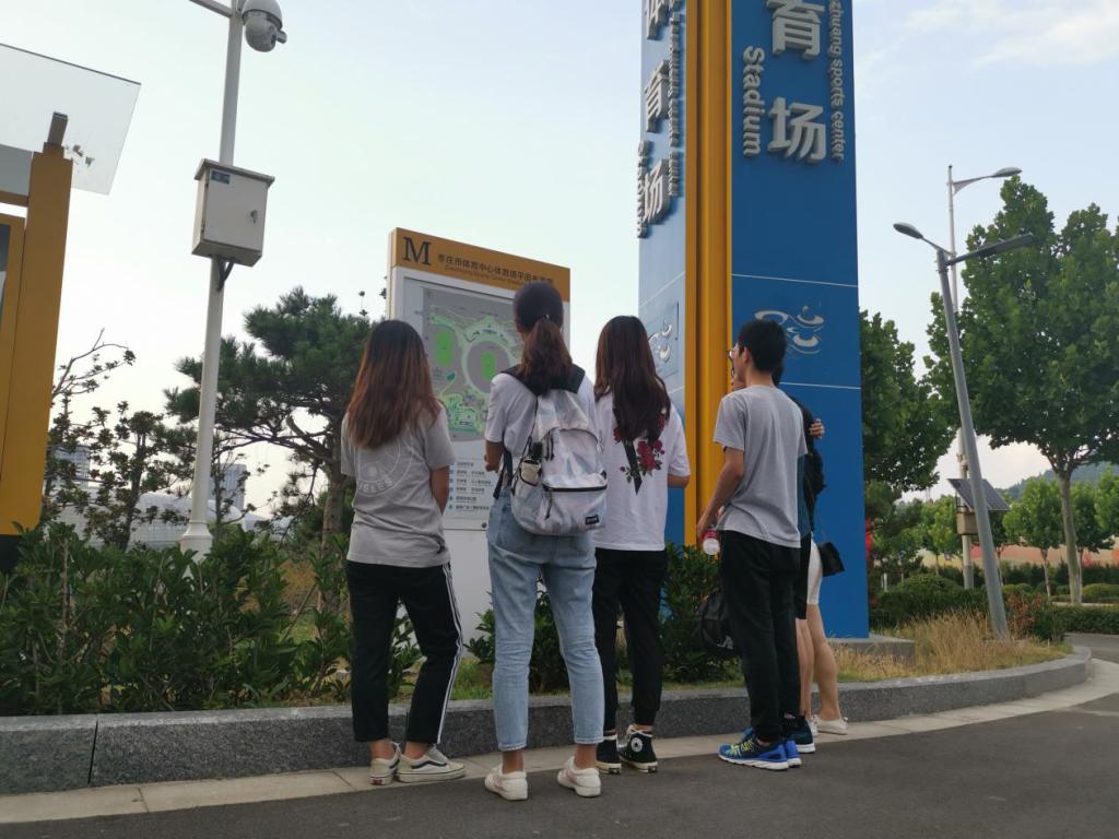 队员们首先来到了体育场入口,仔细了解了体育场提供的场馆与功能,发现在诸多球类专用场地中,并没有排球场。队员们意识到,气排球在枣庄的推广可能会存在场地短缺的问题。