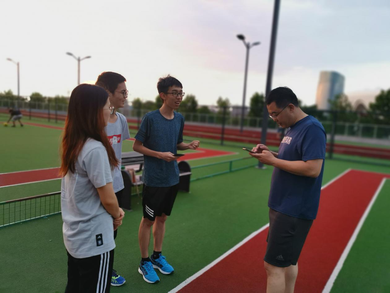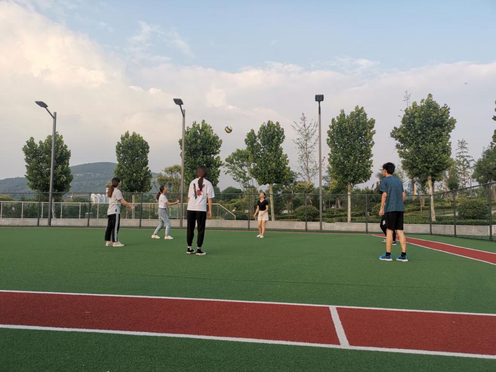接着,团队来到了体育场旁的训练场。训练场场地开阔,地面平整,塑料草皮柔软,有利于各项体育活动的安全开展。傍晚的训练场有不少前来锻炼的市民,年轻夫妇、青少年、儿童居多,老年人较少。市民们以家庭为单位开展着各自的活动,球类活动以三人足球、羽毛球为主,也有不少市民在训练场边缘散步。于是队员们选择了一块较为空旷的场地,进行无专门场地的户外气排球运动示范,吸引了许多市民前来观看。