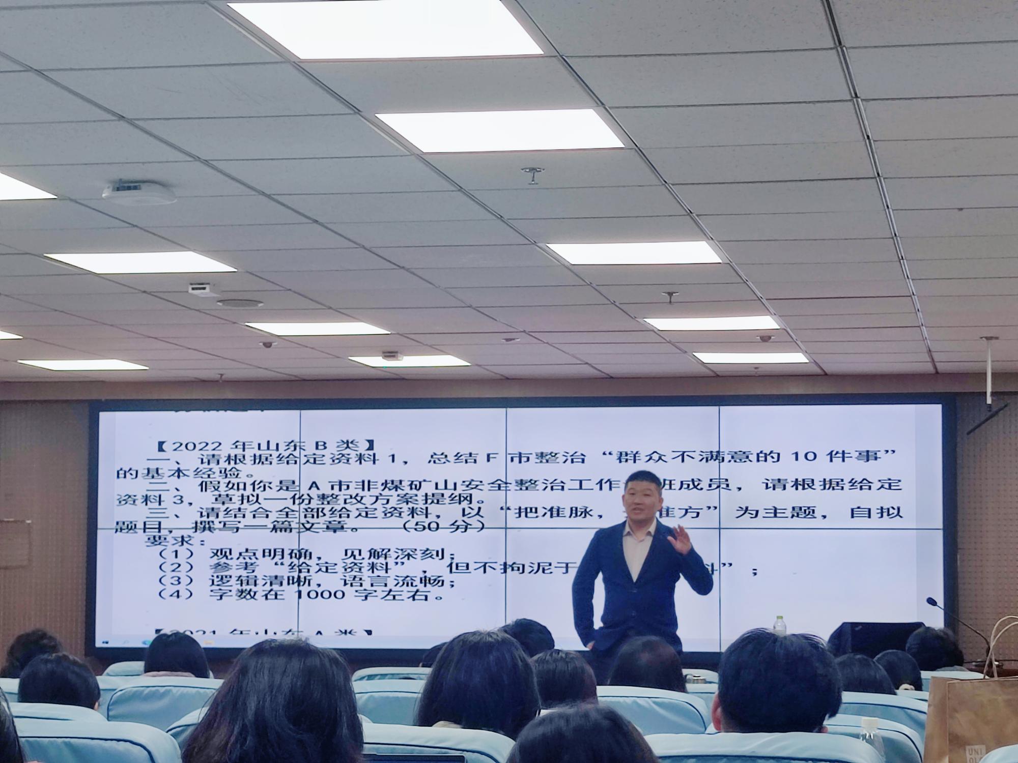在为同学们介绍清楚申论写作的基本理论后,周长帅对近年山东省考与国考的考情进行了分析,以2022年山东省考真题“F市整治群众不满意的10件事”为例,进行了文章写作的方法讲解。他提出,应从分析题干入手,再分析核心段、提取关键词,接着分析全篇材料、形成文章的基本构思,最后列提纲与提笔写作。周老师的讲座条理清晰、风趣幽默、理论功底深厚、知识储备丰富,讲座全场气氛活跃热烈,同学们收获满满。