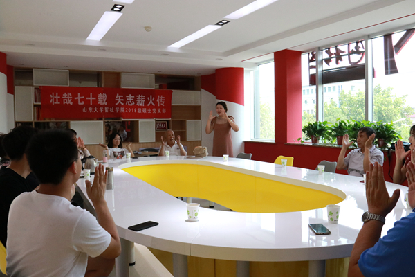 座谈过程中还穿插了有趣的小游戏,活跃了现场气氛,拉近了老党员和同学们的距离。队员贾丰竹带领大家做了名为“笑口常开”的小游戏,通过摆出不同手势来分别代表“笑口常开”这四个字,活跃了现场气氛。座谈会最后,队员徐英新带领大家重温入党誓词,回忆起了入党时的激情和豪迈。队员们还为老党员分发了纪念品,在欢笑声中,座谈会圆满结束。